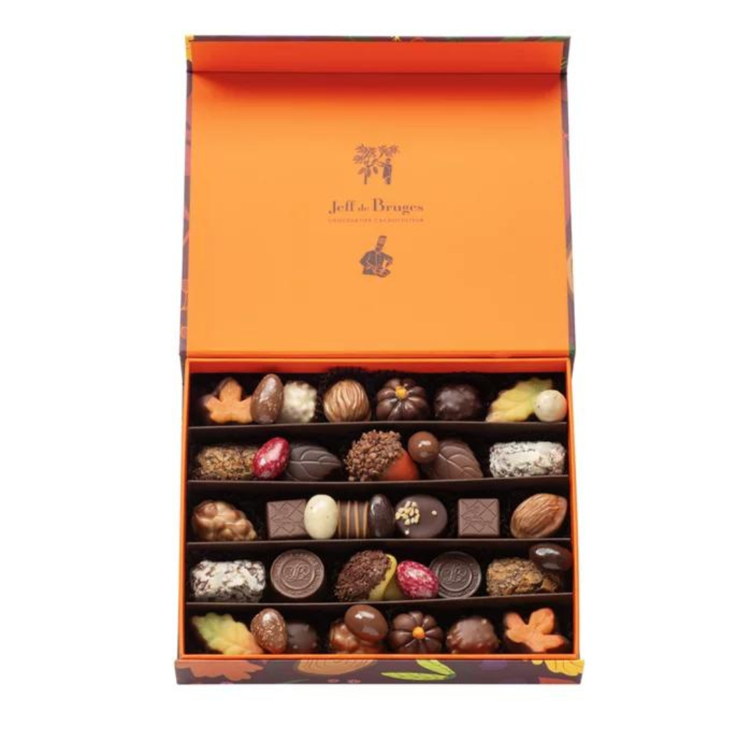 Craquez pour la diversité de nos délicieux chocolats d’automne : pralinés tendres ou croustillants, pâtes d’amande d’automne moelleuses et gourmandes ou amandes enrobées de chocolat…. Le tout, délicatement présenté dans un coffret au décor d’automne coloré avec un toucher sophistiqué, sublimé par de jolies feuilles d’automne.